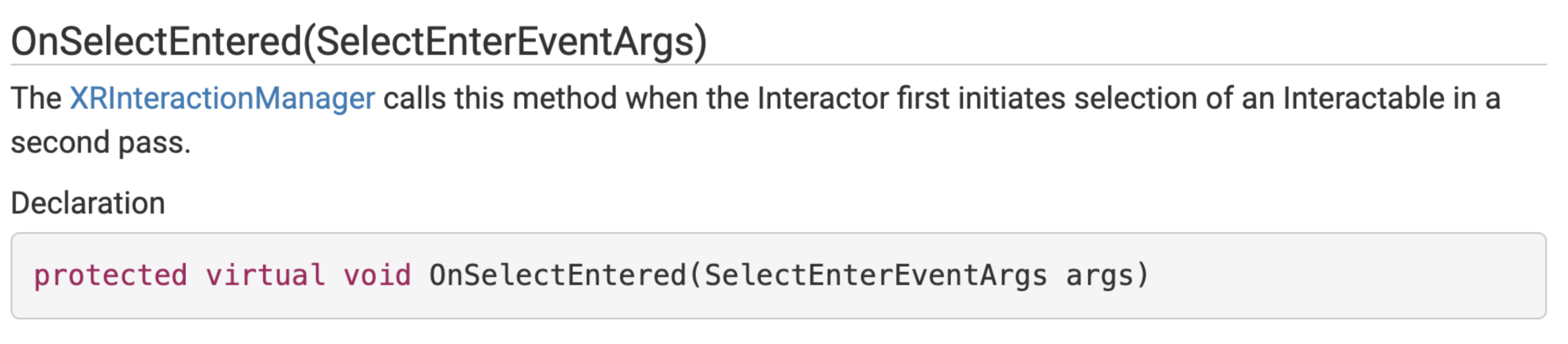 protected virtual void OnSelectEntered(SelectEnterEventArgs args)