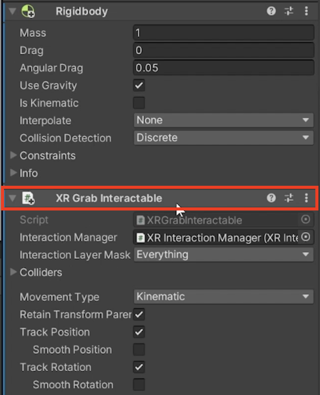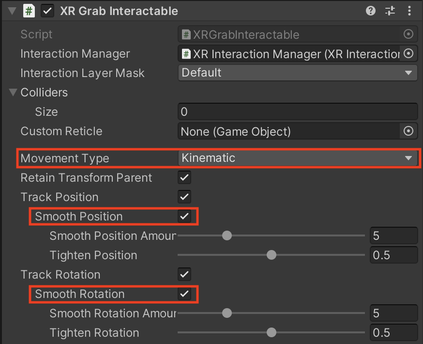 - In the XR Grab Interactable component, enable the Smooth Position and Smooth Rotation properties.