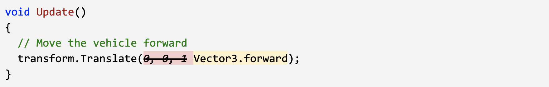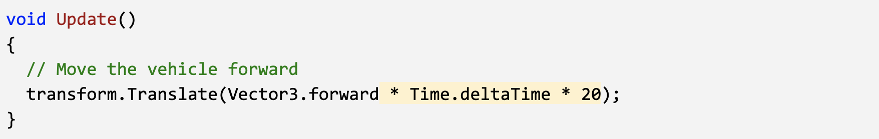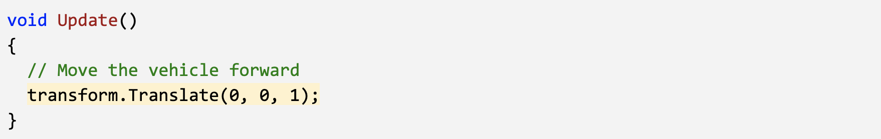 - In the Update() method, add a comment that you will: // Move the vehicle forward