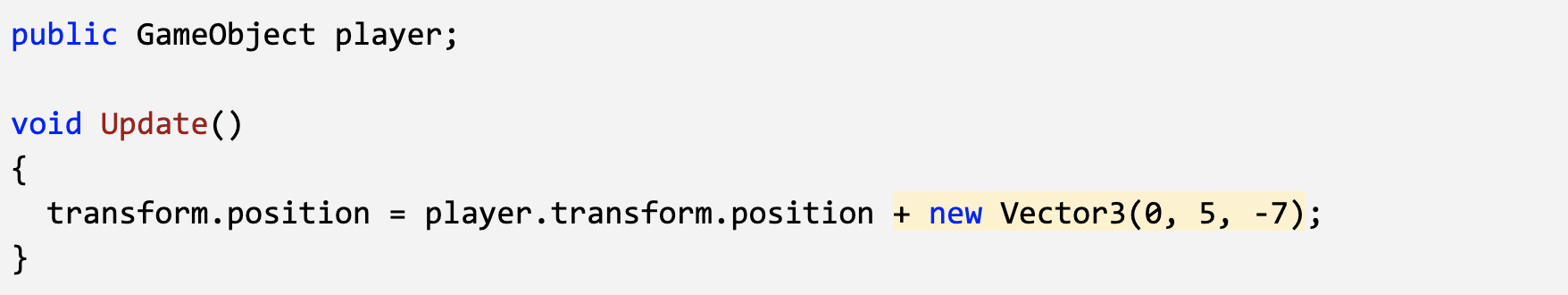 - In the line in the Update method add + new Vector3(0, 5, -7), then test