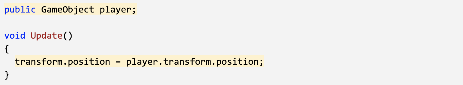 - Add public GameObject player; to the top of the script