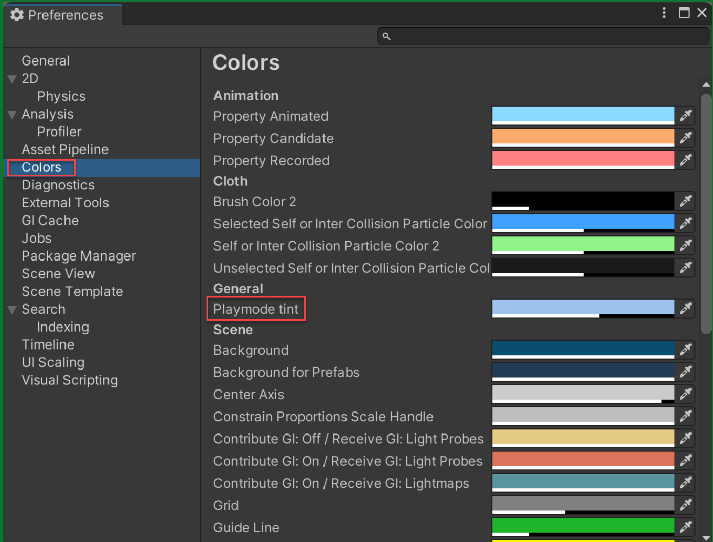 - In the left menu, choose Colors, then edit the “Playmode tint” color to have a slight color