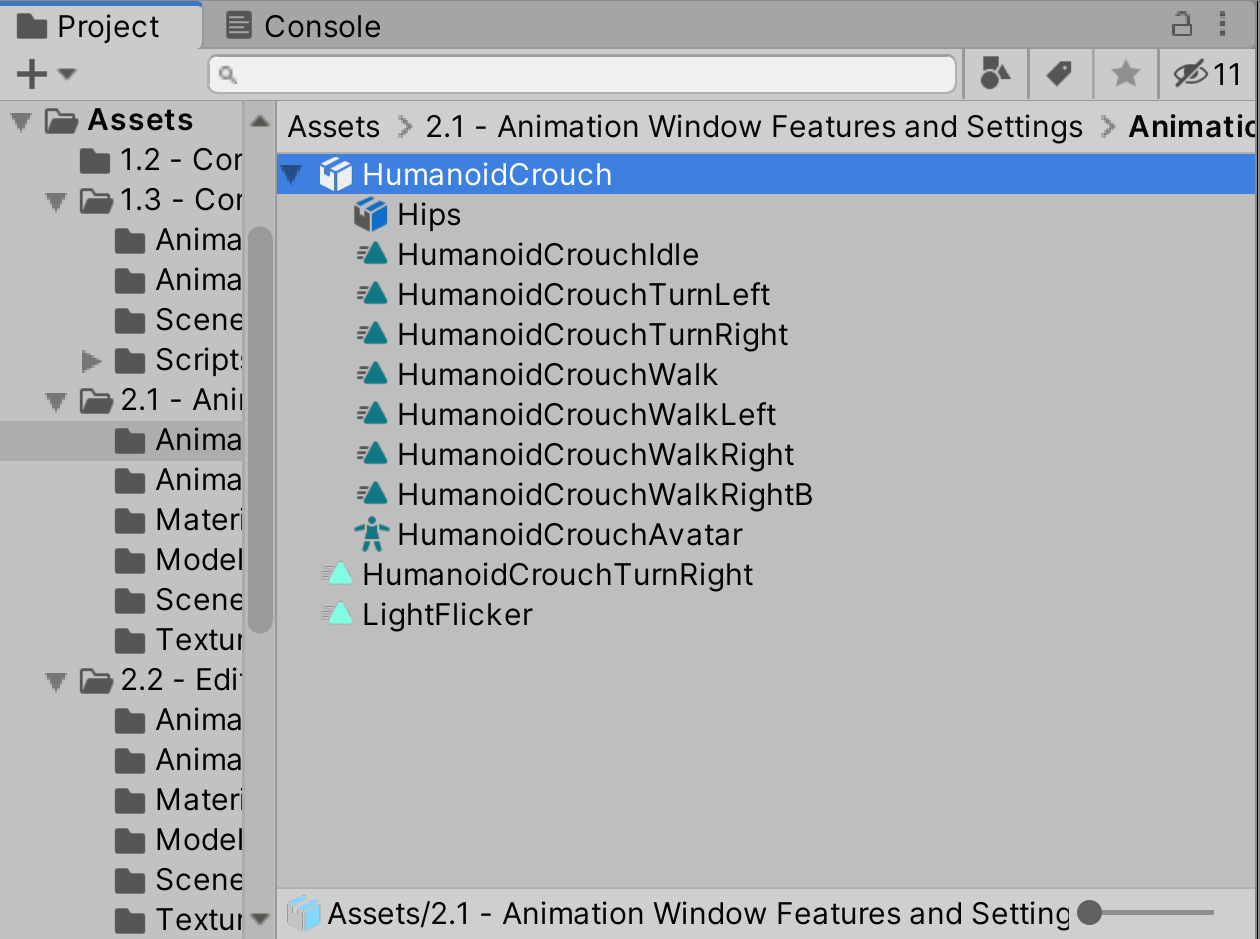 1. In the Project window, go to Assets > 2.1 - Animation Window Features and Settings > AnimationClips folder and select the HumanoidCrouch model.