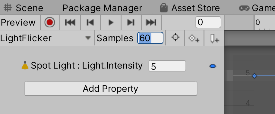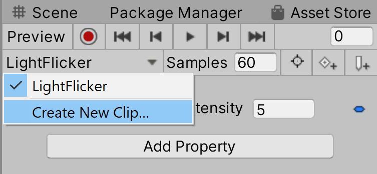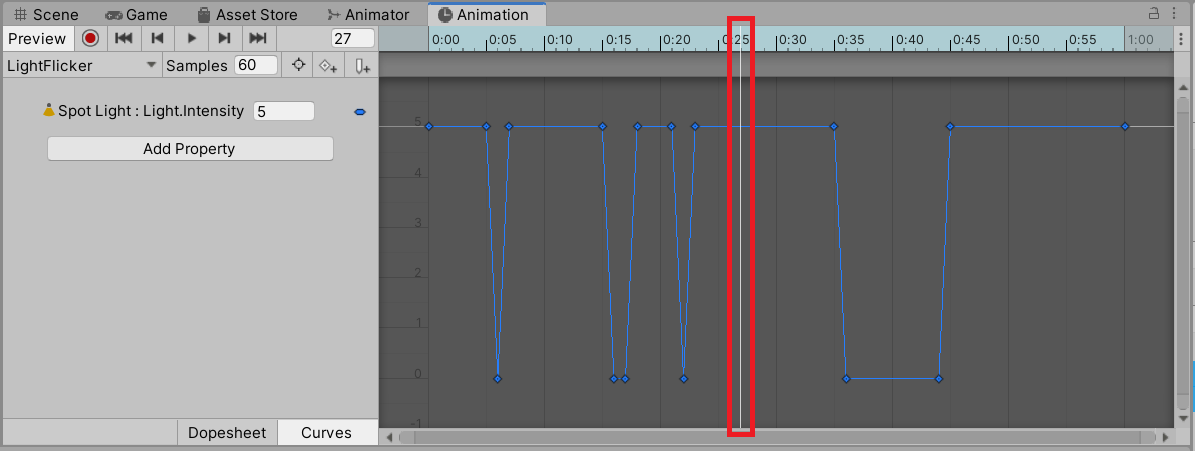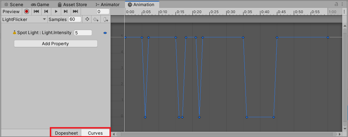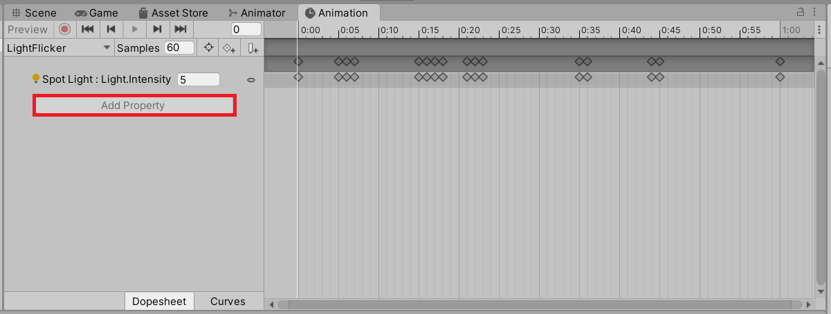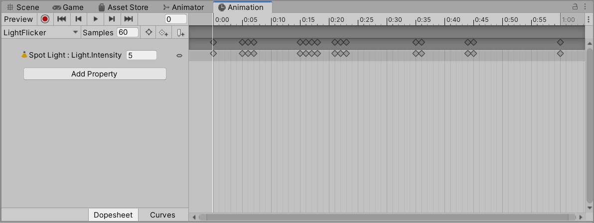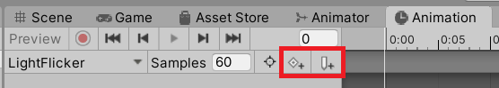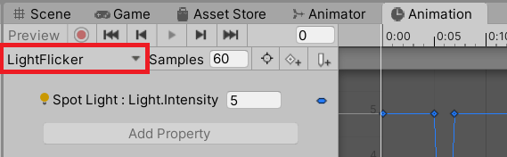 - In the Hierarchy, select the StreetLamp GameObject. The LightFlicker Animation Clip will appear in the Animation window.