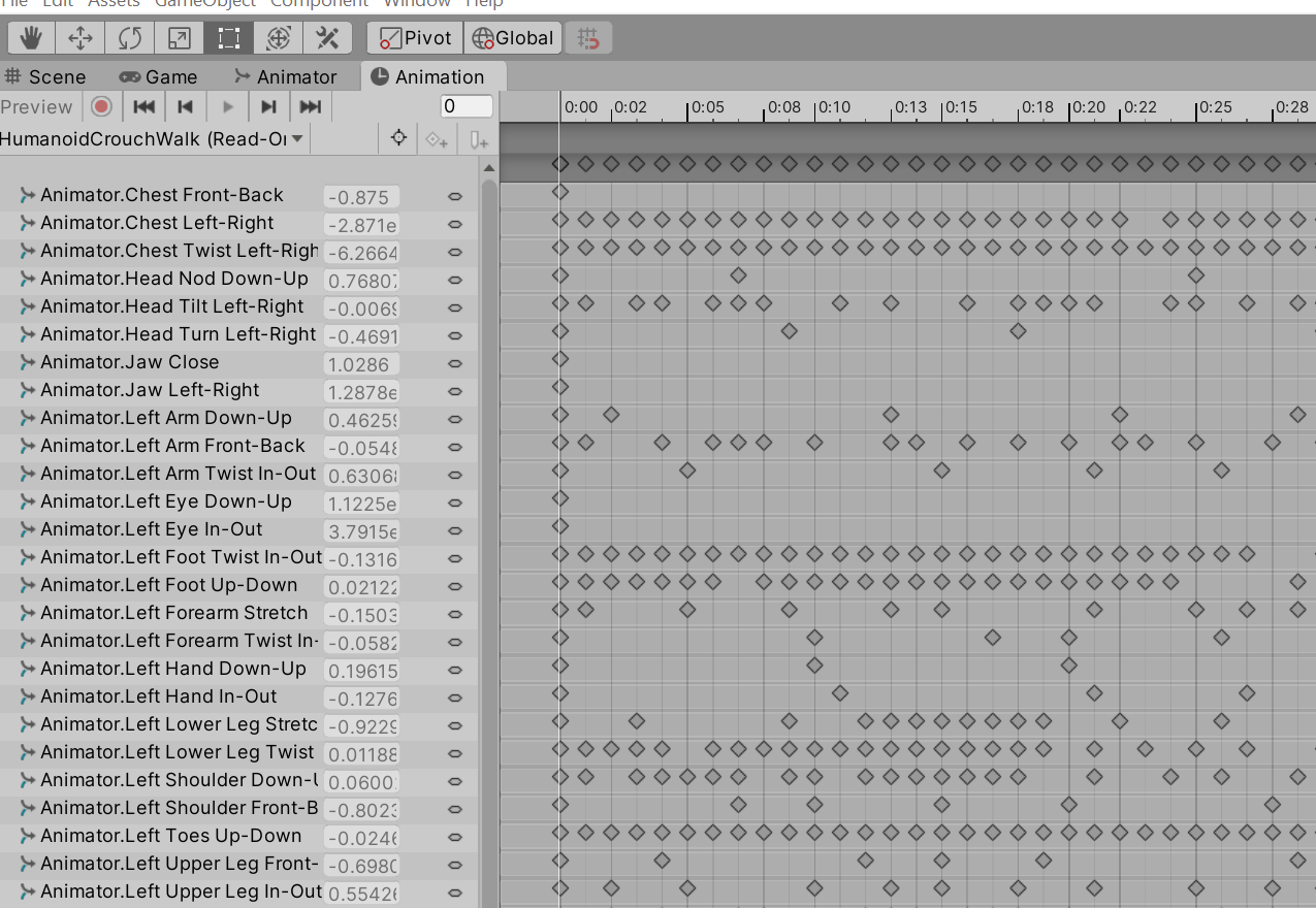 You can now edit the properties in the new Animation Clip, but remember that it is no longer associated with the HumanoidCrouch model.
