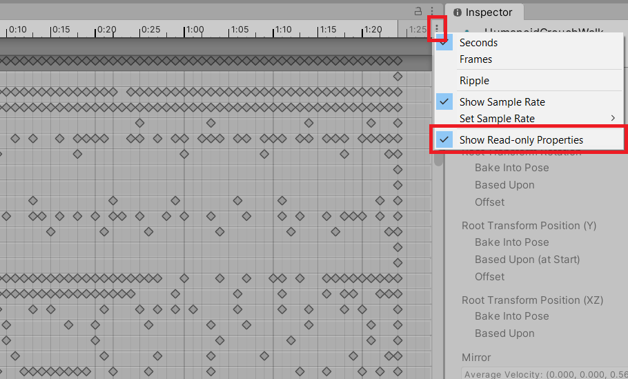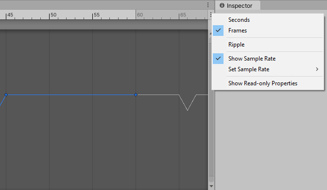 1. In the Animation window, select the contextual menu next to the timeline (the lower of two adjacent context menus).