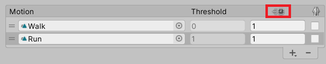 For each Motion on the list, there are a number of per-Motion settings. These settings depend on the type of Blend Tree being used.