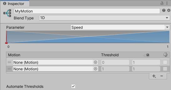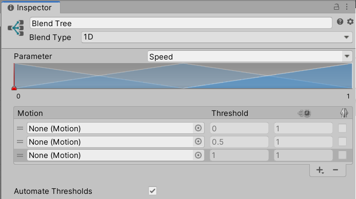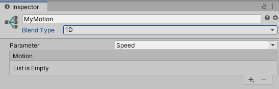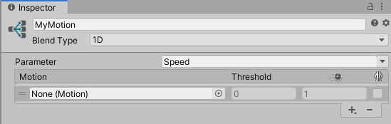 Because you selected a 1D Blend Tree, you’ll first see a field for the Motion itself, a float for the Threshold of the Motion, and then a second float for the Speed.
