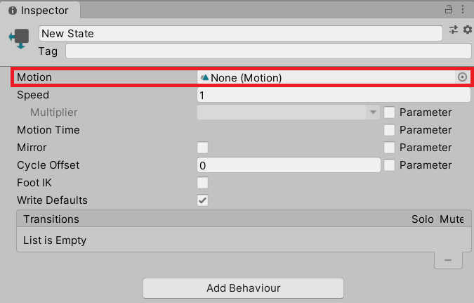 Each Animator State plays a Motion. Motion is a term that refers to either an Animation Clip or a Blend Tree.