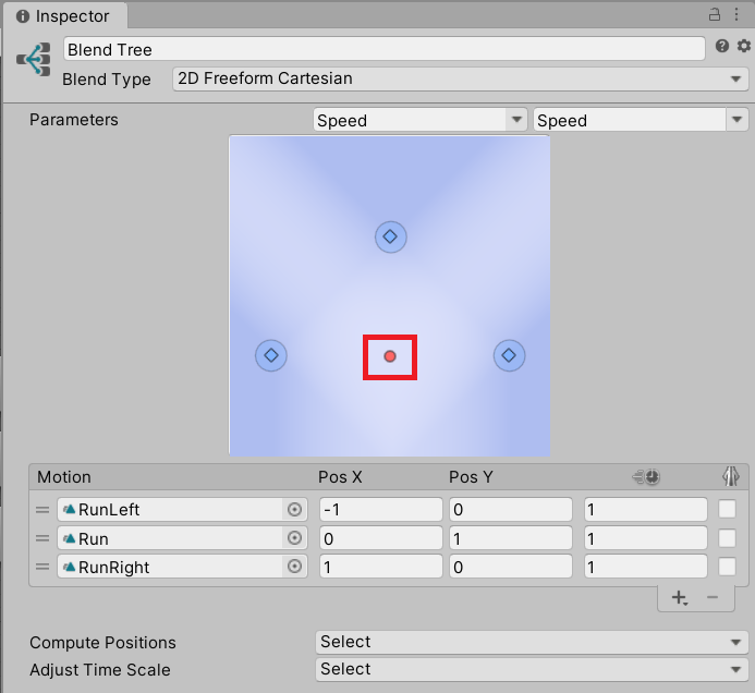 When you use this type of Blend Tree, you can also include a single Motion at the center blend position (0, 0) to represent no or neutral direction. This is optional, but recommended.