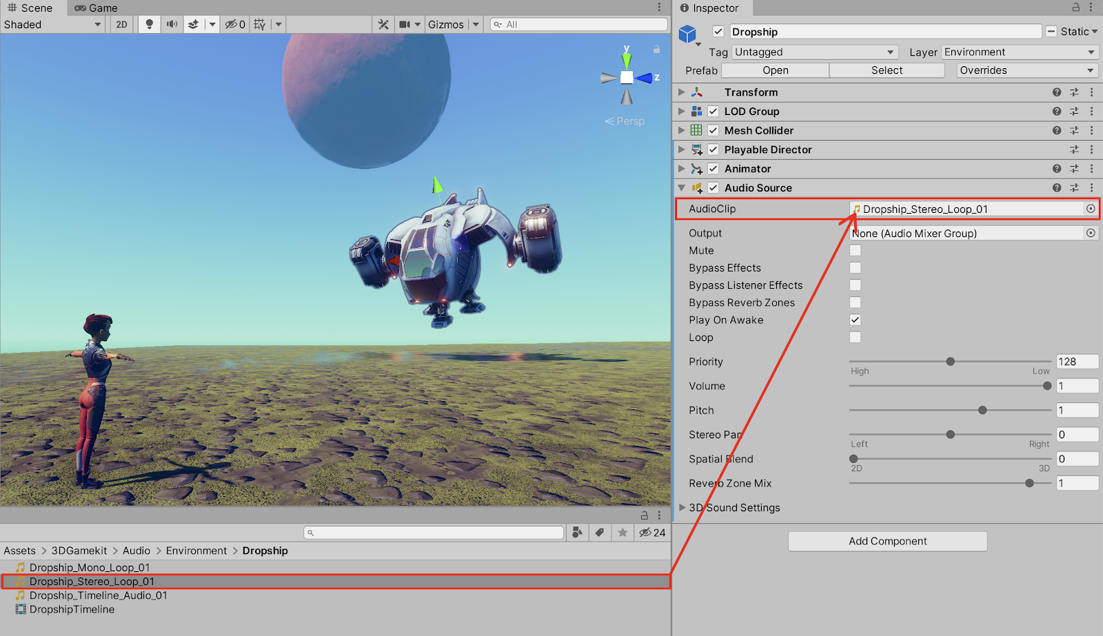 2. Select an audio file in the Project window. We will select the audio file titled: “Dropship_Stereo_Loop_01” provided within the 3DGamekit > Audio > Environment > Dropship folder in the Project window. Drag the clip into the Audio Source component’s AudioClip field.