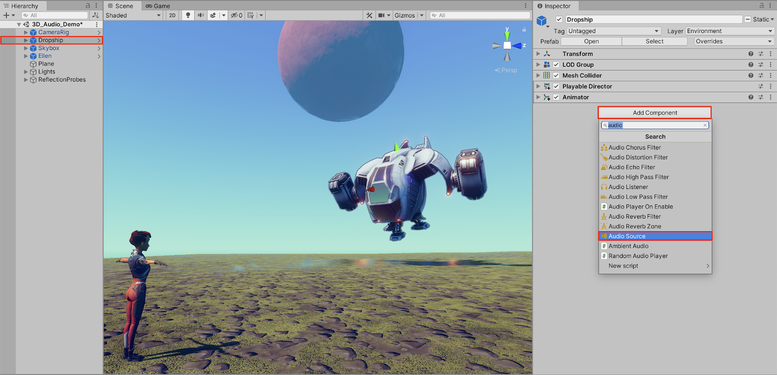 1. With the spaceship vehicle GameObject titled “Dropship” selected in the Hierarchy window, select the Add Component button in the Inspector. Type “audio” to search for and then select: Audio Source.