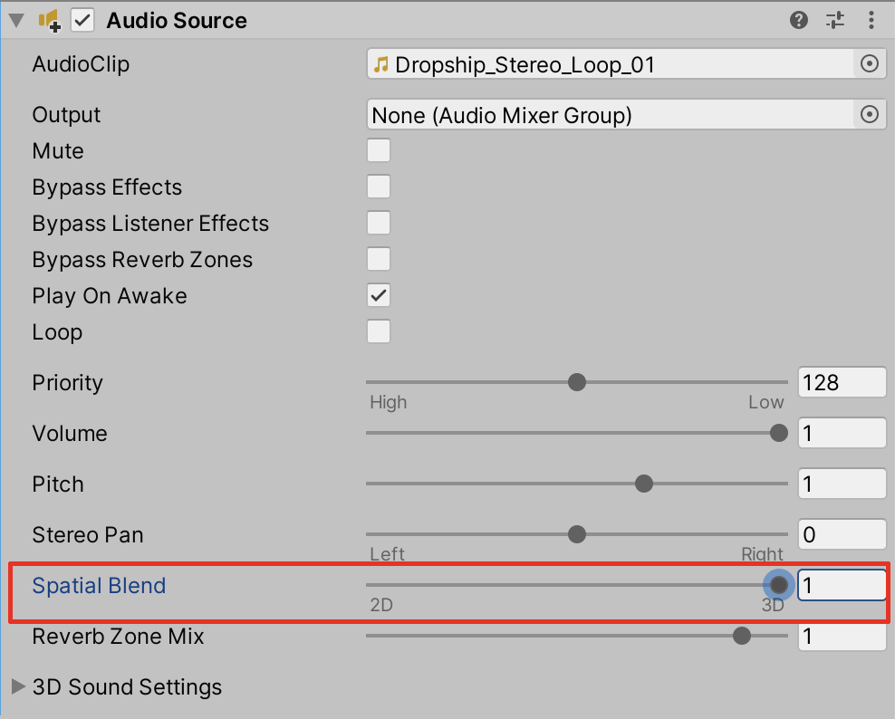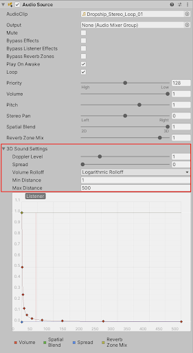 5. Select to expand the 3D Sound Settings of the Audio Source component in the Inspector to make further adjustments.