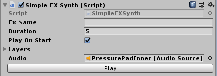- Fx Name When in Play mode, the Fx Name field is used to share the AudioClip among all SimpleFXSynth instances. This means each unique sound effect should have a unique Fx Name.