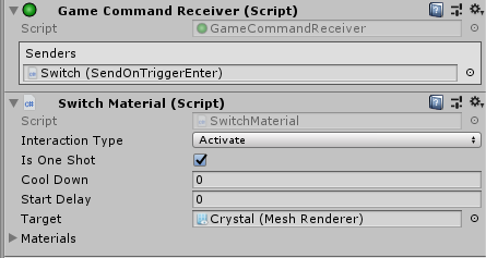This command is a GameCommandReceiver, which switches materials on the target object. Each time the command is received, the next material in the materials list is applied. When the last material is reached, the first material will be used as the next material.