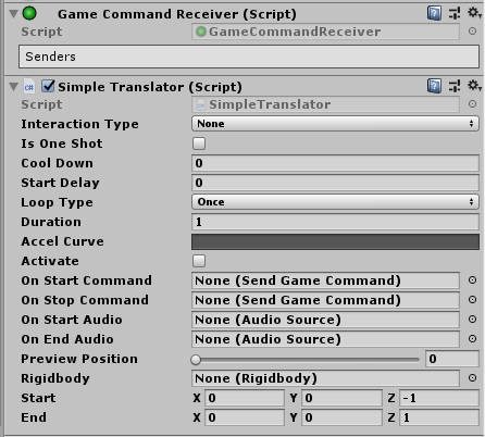 This class moves a GameObject’s rigidbody from a specified Start position to a specified End position. This command is a GameCommandReceiver. When the specified command is received, it will perform a translation on the transform.