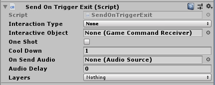 - Send On Trigger Enter: Generates all manner of gameplay interactions. This is part of the command system. The Send On Trigger Enter script fields are summarised below. For full details on using the command system, see the command system page.