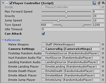 The Player Controller script holds all the information for how Ellen behaves in the game. The exposed settings here mostly control movement but you can tweak any of the variables within the script itself by opening it.