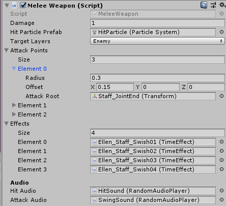 A Melee weapon is composed of Attack Points which are spheres that define what part of the weapon causes damage. They are defined as an offset from a GameObject (called the Attack Root) and a radius for their size.