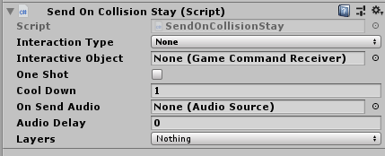 If this component is attached to a trigger collider, a collision with another object that is in the specified layer(s) will cause it to activate and send a command every frame that the game object is inside the collision area. This script sends its command from the OnTriggerStay call of the MonoBehaviour class.