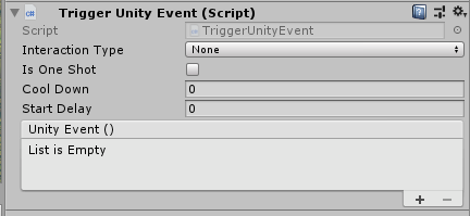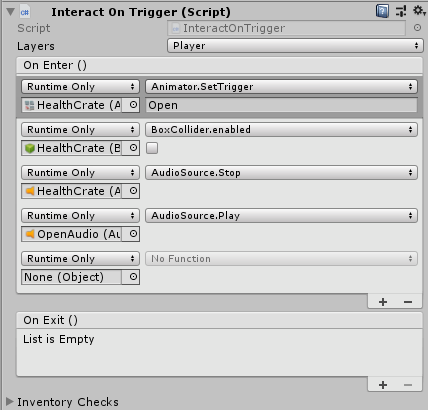 A good use case example of an Interact On Trigger is the Health Crate prefab, which increases the player’s health when the player damages it. Find it in the Project window in Prefabs > Interactables. The HealthCrate prefab uses the Interact On Trigger script: