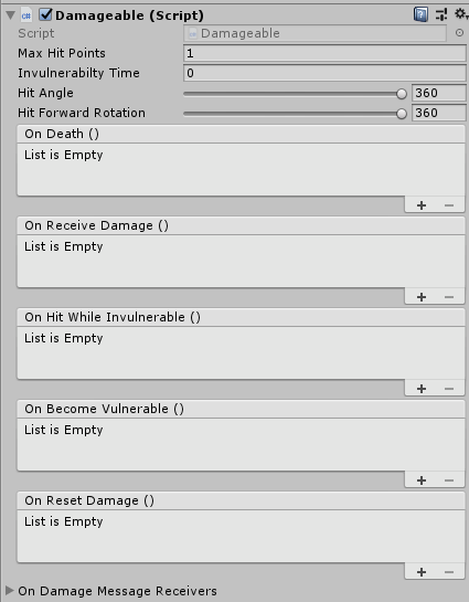 When first instantiated, one of the events in the Interact On Trigger script is missing. On this event, the player needs to be told its health is getting reset. To do this, select Ellen from the scene as the GameObject to call a function on. Then from the function drop-down menu, select Damageable > ResetDamage().