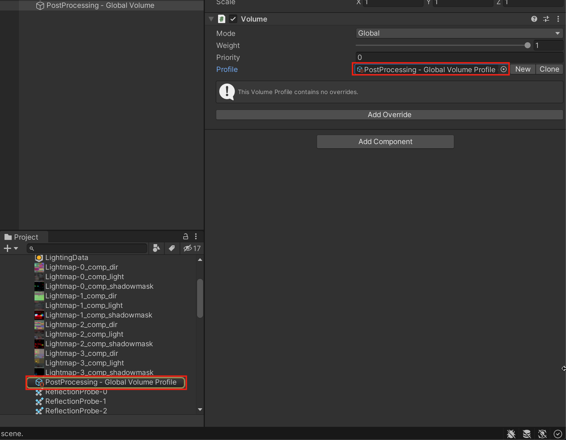 1. Select the Global Volume object in the Hierarchy