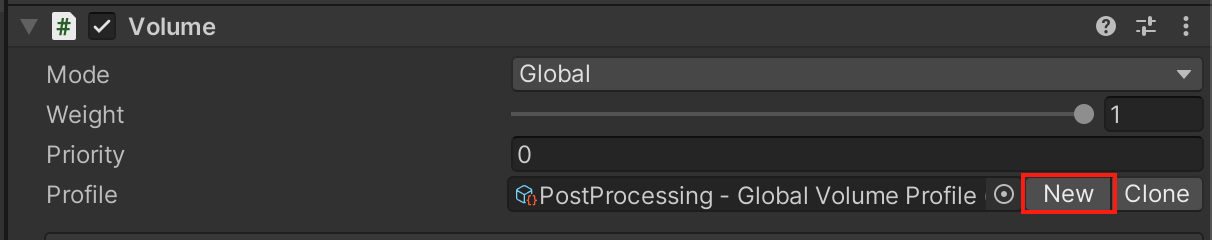 1. Select the Postprocessing Global Volume object in the Hierarchy, then in the Volume component, select New to create a new profile.