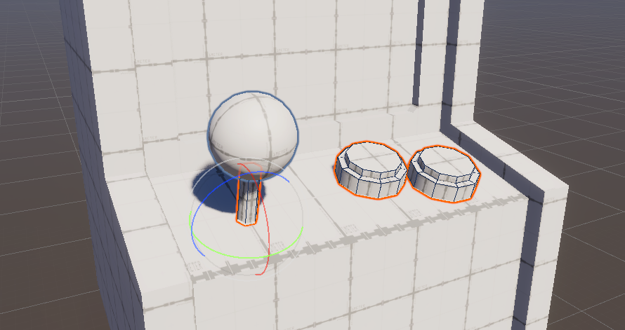 Prepare three basic shapes: one sphere, one slender cylinder, and another wider cylinder. Put the sphere on top of the slender cylinder to make a joystick. Use the Shift+Scale tool to make a button from the top face of the wider cylinder. After making a button, copy the whole cylinder using Ctrl+D (macOS: (Cmd+D) and paste it in the space right next to the first one.