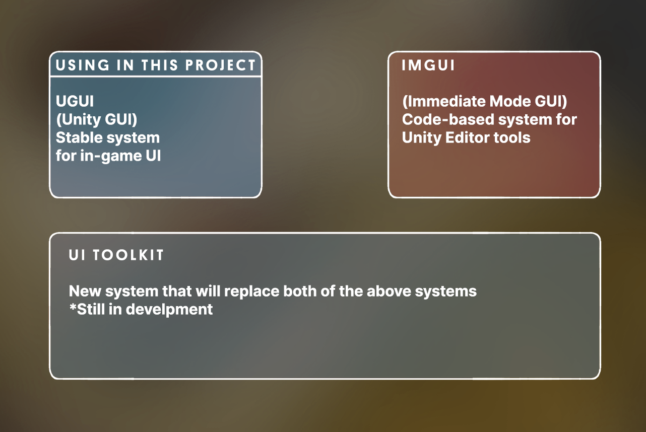 Before you start adding new UI elements, you should know that there are actually three entirely separate systems available for developing UIs in Unity: uGUI, IMGUI, and UI Toolkit. That’s a lot of similar-sounding acronyms, so let’s briefly look at each system.