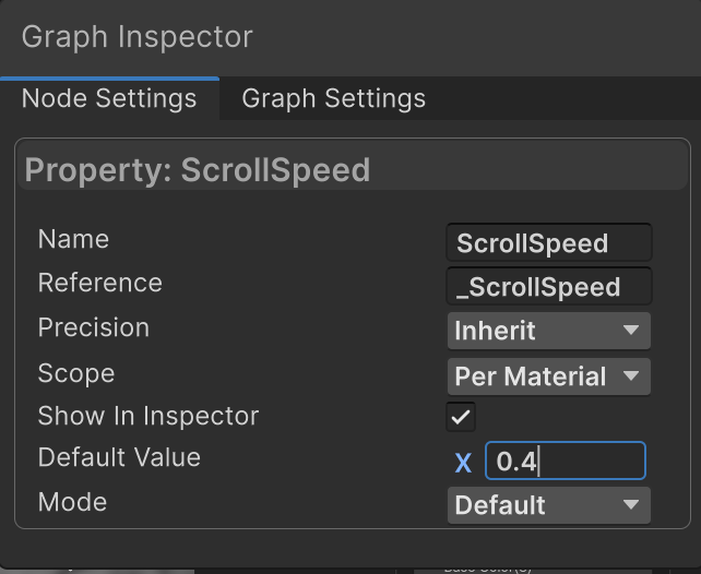 7. Para cambiar el valor predeterminado, selecciona el nodo ScrollSpeed y en el Graph Inspector, ingresa un nuevo valor predeterminado. Experimenta para encontrar un valor que dé un buen brillo.