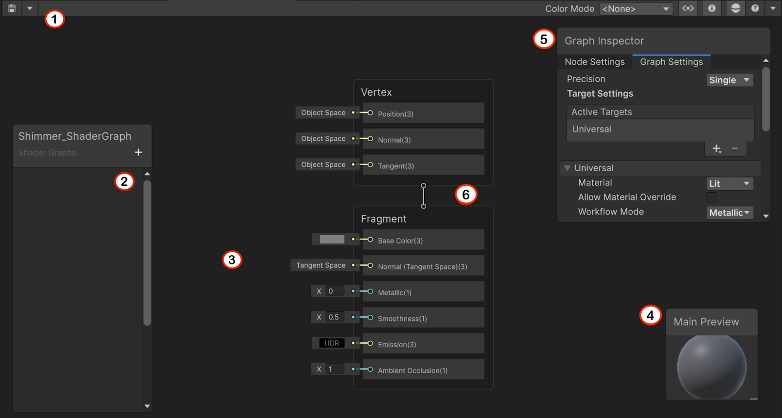 - El espacio de trabajo (3) es donde crearás el gráfico de nodos de tu sombreador.