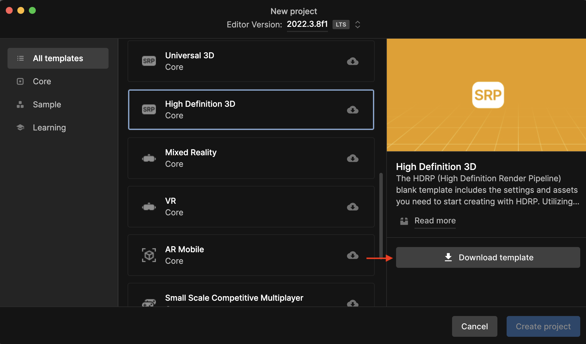 To download templates, open the Unity Hub, and select New Project to access the template list.