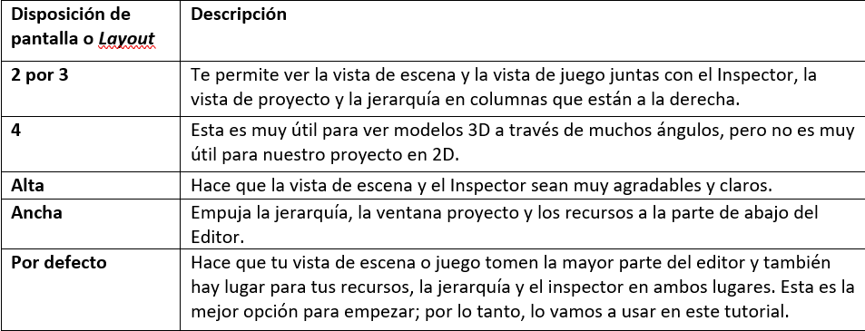 Puede diseñar en tu Editor Unity de distintas maneras. Cada diseño o layout tiene sus propias ventajas y te darás cuenta de qué diseño funciona mejor para ti a medida que los vayas probando. Vamos a echarle un vistazo a cada uno para que veas lo que está disponible.