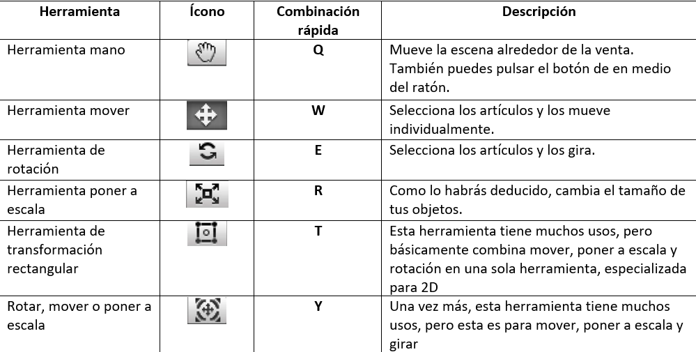 Estas herramientas mueven y manipulan los GameObjects en la vista de escena o Scene view. Haz clic sobre ellas para activarlas. La siguiente tabla te muestra qué combinación de acceso rápido en el teclado habilita cada herramienta: