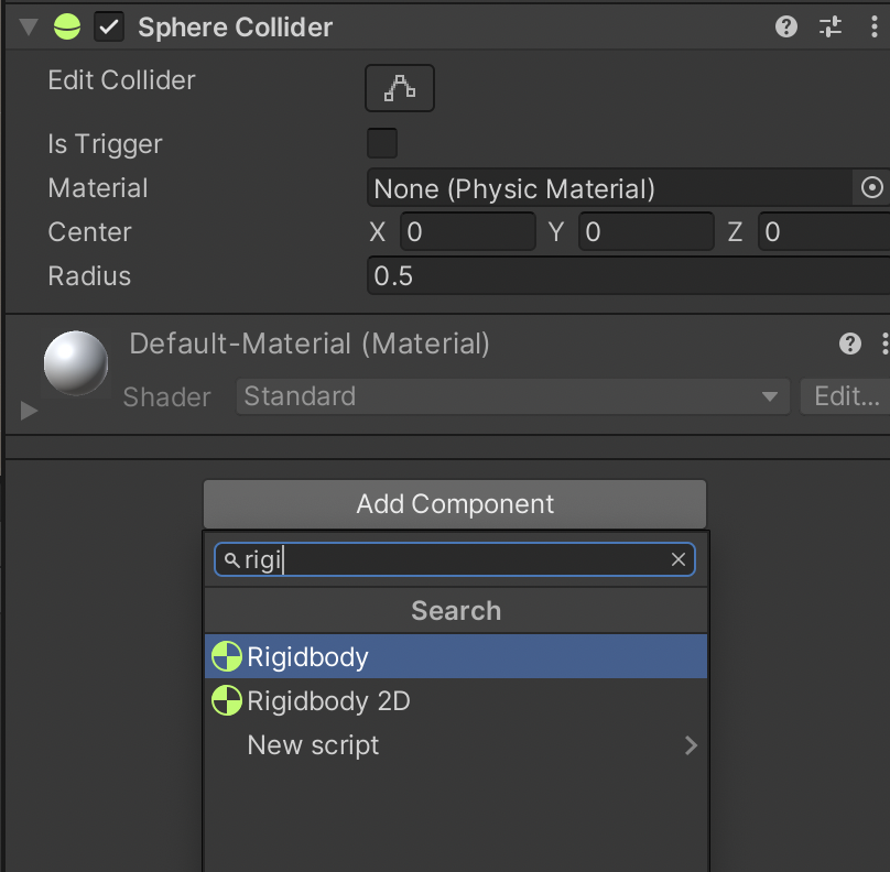 Note: There are two options available: Rigidbody and Rigidbody 2D. Make sure you select the Rigidbody component, not the 2D one.