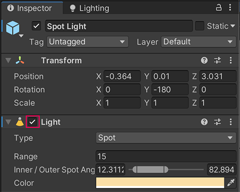 5. In the Inspector, find the Light component and disable it. This turns the light off in the Scene view — enable the component again before continuing.
