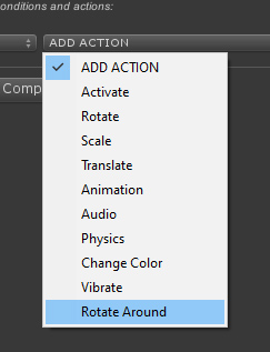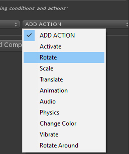 Then in the Inspector you will see the setup for the interaction. As we want all elements to rotate right from the beginning we don’t need to set any condition nor delay so go directly to the “ADD ACTION” list and select “Rotate”. This will add a Rotate behaviour to the interaction.