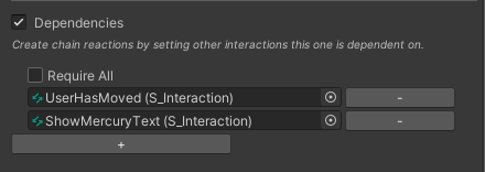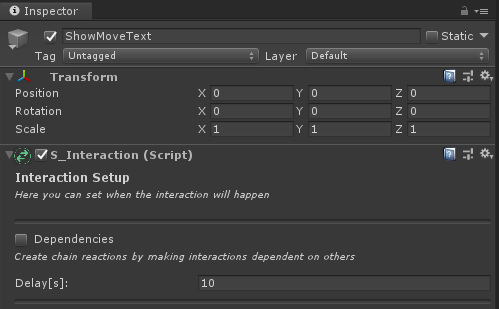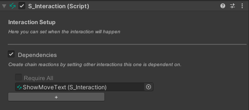 In the Inspector, check ‘Dependencies’ and drag the ‘ShowMoveText’ interaction. This means the current interaction will only be active after the instruction has shown.