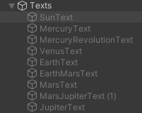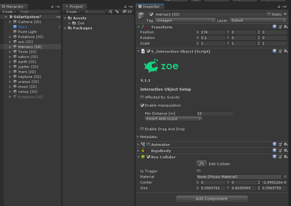 Note: if you feel that it is hard to aim at Mercury you can go inside Mercury’s (IO) and scale up the object called “Gaze”; it is a collider detecting if an invisible ray coming from the camera is actually colliding with it, meaning the user is looking at the object.
