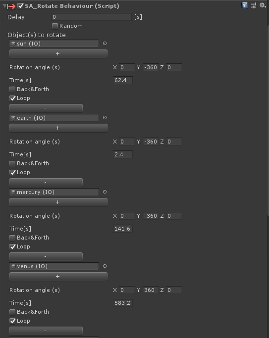 You can now add a section to the behaviour by clicking the “+” button at the very bottom. You will be able to set a new rotate behaviour for another element, for example Earth. Drag the Earth(IO) in the “Object to rotate”. All planets, except Venus and Uranus rotate counterclockwise (direct rotation) so set the Y rotation also to -360°. Set 2.4 seconds for the time and check Loop as well.