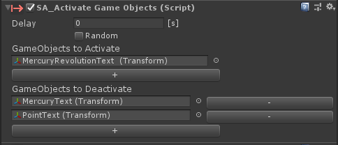 Another action that you may want to add here is one that hides the information above the planet otherwise it will just stay floating in mid-air. Add the “Activate” action and set “MercuryText” under GameObjects to Deactivate. You can add the ‘TrigRevolutionText’ to the objects to be deactivated also. Finally show here the second text about Mercury’s revolution to indicate to the user that he/she just triggered it.