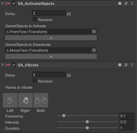 Now to actually indicate the user to look at the controller and see the instruction we are also going to add a vibration on the controller. Go again to the “ADD ACTION” list and select “Vibrate”. Select the hand in which the instruction is attached and then set the parameters of the vibration. You need at least half a second and around 0.5 of intensity to feel something. We recommend you try different values and test by yourself the ones that seems the best.