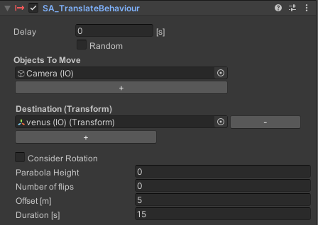 Drag the Camera (IO) under Objects To Move and set Venus (IO) as the target. We want a linear movement so leave the parabolic height and the flips at 0. Then set an offset which is a distance from the center of Venus at which the user is going to stop, for example 5. Finally set the duration of the translate which means how long it will take to the user to reach Venus, basically the speed of the movement. As it is hard for the brain to feel comfortable when there are camera movements that are not controlled and/or are too fast we recommend setting at least 15 seconds.