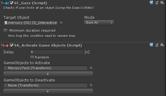 Under TargetObject, drag “Mercury (IO)”. Leave the mode to “Gaze At” as we want this to detect when the user gazes at Mercury.