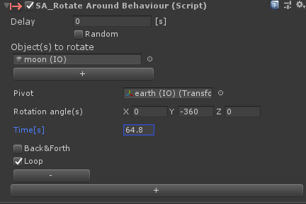 Drag moon(IO) under ‘Object to rotate’ and under ‘Pivot’ drag the earth’s. Rotation angle is of -360 on Y, set the time to 64.8s (27*2.4) and check the Loop function.