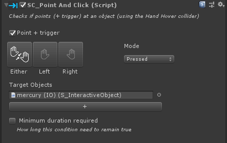 Then add the “Point” condition under “ADD CONDITION”. Choose the hand or leave Either hand then drag Mercury(IO) under ‘Target Objects’.