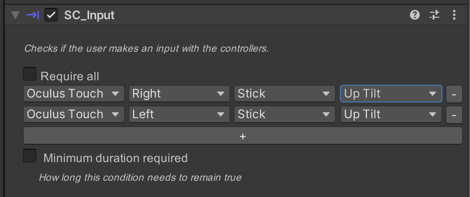 Now add the ‘Input’ condition under ‘ADD CONDITION’, this allows you to know if the user has touched any button of the controller. Select the platform (here we use Oculus), the controller, the button which is the 'Stick' and then the state 'Up Tilt' which is the most probable direction in which a user would use the joystick to move.