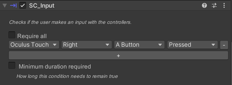 Now we are going to create an interaction that is detecting that the user moved. Duplicate the Empty interaction again and rename it ‘UserHasMoved’. This is true if the user moved after seeing the instruction so the conditions will be that the instruction has shown and the user used the joystick.