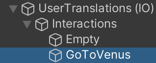 Finally let’s help the user move between planets as distances are so long. Create a new ‘Empty object’ that you can call “UserTranslations”and convert it into an Interactive Object. A translation is a transformation in which an object moves from one position to another.